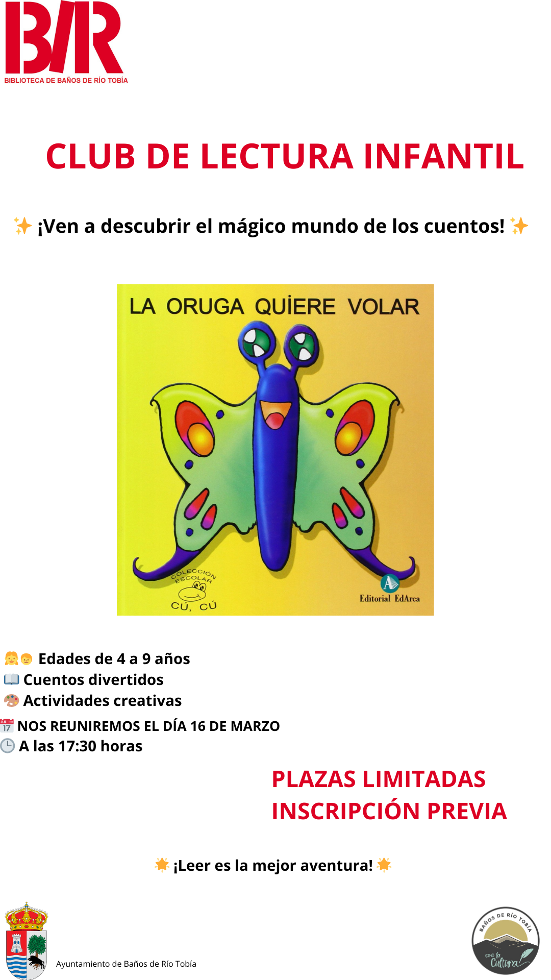 Tenemos la segunda reunión de "El club de los valientes". En esta ocasión leeremos y hablaremos sobre "La oruga quiere volar", de la autora R.N. Martí y con ilustraciones de J.X. Sabaté. Acabaremos la reunión creando unas bonitas mariposas.