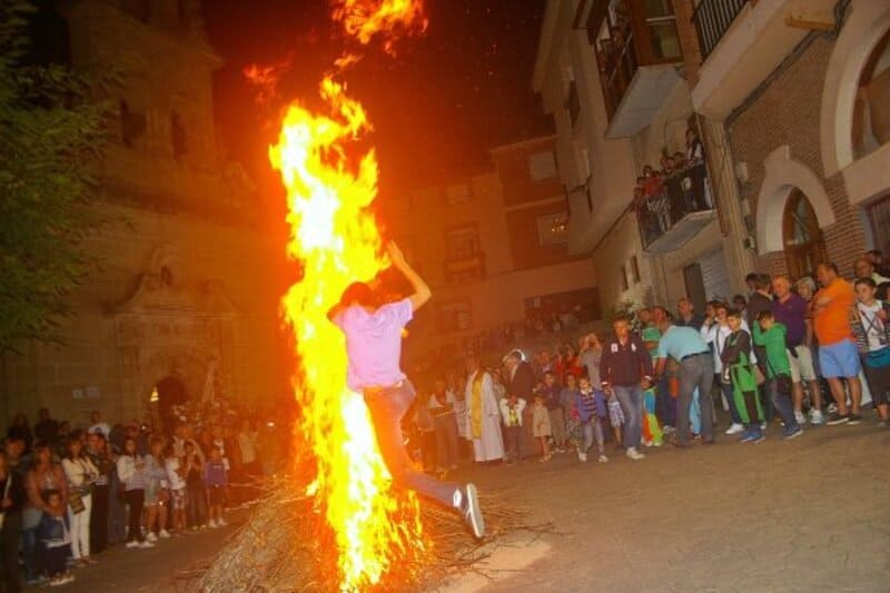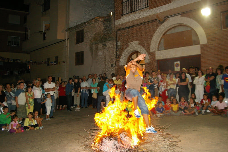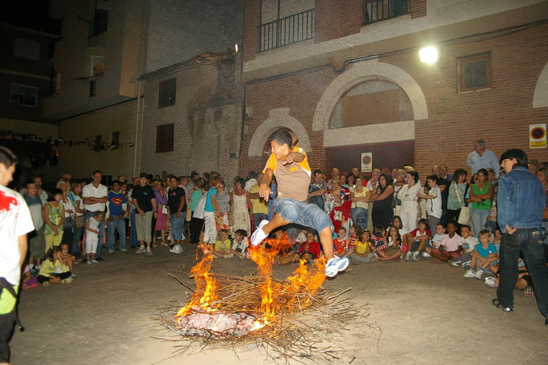 A veces para entonces se hace de noche y las llamaradas iluminan el ambiente. Cuando aminora el fuego algún joven o niño se anima tras una carrera a saltar por entre las llamas. Poco a poco van creciendo el número de saltadores mientras se escucha la música al lado.